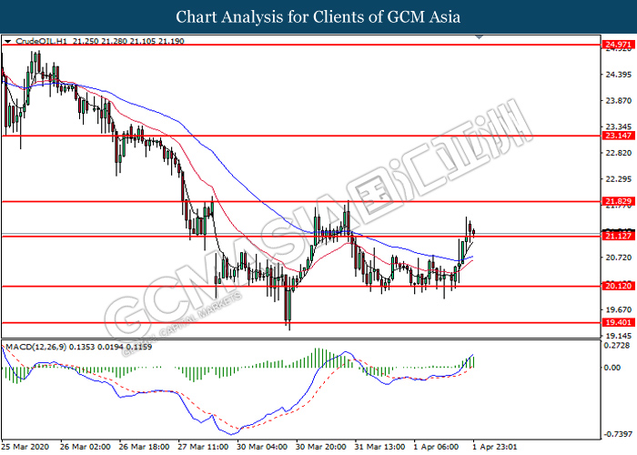 CrudeOIL, H1: Crude oil price was traded lower following prior retracement from the higher level. However, MACD which illustrate bullish bias momentum suggest the commodity to undergo technical correction toward higher level in short term.