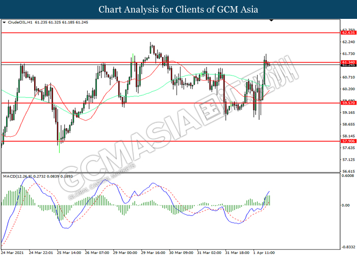 CrudeOIL, H1: Crude oil price was traded higher while currently testing the resistance level at 61.35. MACD which illustrated increasing bullish momentum suggest the commodity to extend its gains after it successfully breakout above the resistance level.