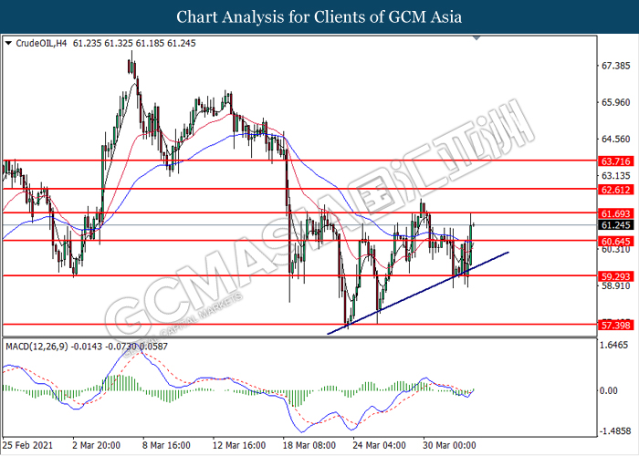 CrudeOIL, H4: Crude oil price was traded higher following prior breakout above the previous resistance level at 60.65. MACD which illustrated diminishing bearish momentum suggest the commodity to extend its gains toward the resistance level at 61.70.