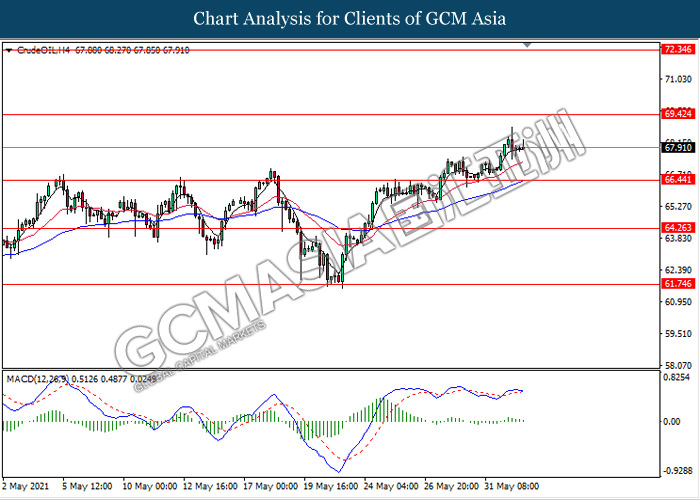 CrudeOIL, H4: Crude oil price was traded higher following prior rebound from the support level 66.45. However, MACD which illustrate diminishing bullish momentum signal suggest the commodity to be traded lower as a technical correction back towards the level 66.45.