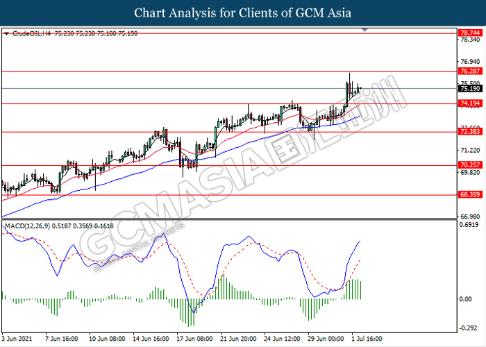 CrudeOIL, H4: Crude oil price was traded higher following recent breakout above the previous resistance level 74.20. MACD which illustrate diminishing bullish momentum signal suggest the commodity to experience a technical correction towards the support level 74.20.