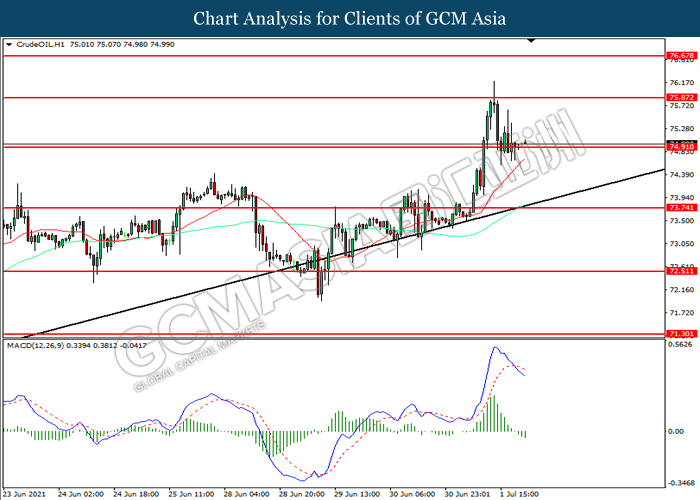 CrudeOIL, H1: Crude oil price was traded lower while currently testing the support level at 74.90. MACD which illustrated increasing bearish momentum suggest the commodity to extend its losses after it successfully breakout below the support level.