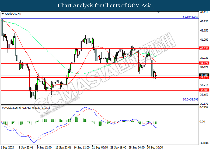CrudeOIL, H4: Crude oil price was traded lower while currently testing the support level at 38.05. MACD which illustrated increasing bearish momentum suggest the commodity to extend its losses after it successfully breakout below the support level.