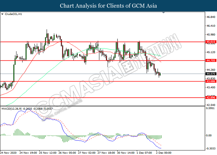 CrudeOIL, H1: Crude oil price was traded lower following prior breakout below the previous support level at 44.70. However, MACD which illustrated diminishing bearish momentum suggest the commodity to be traded higher in short-term as technical correction.