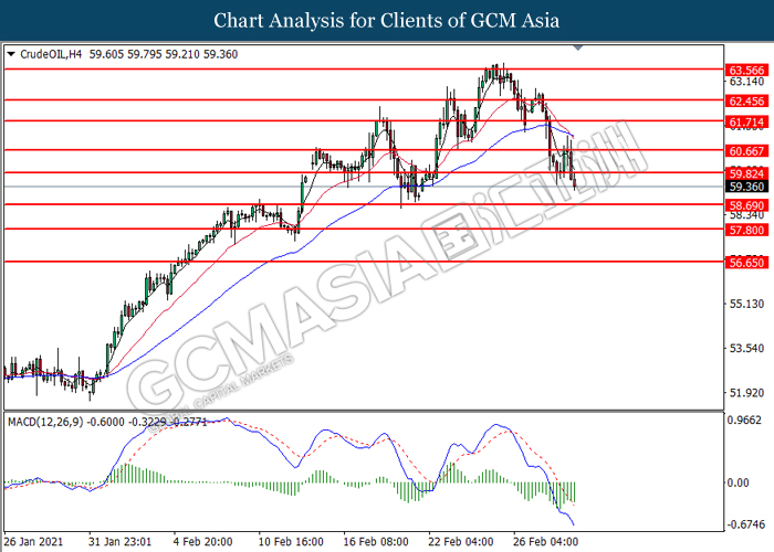 CrudeOIL, H4: Crude oil price was traded lower following prior breakout below the previous support level at 59.80. MACD which illustrated bearish bias momentum suggest the commodity to extend its losses toward the support level at 58.70.