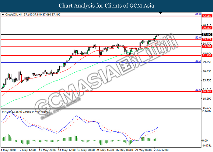 CrudeOIL, H4: Crude oil price was traded higher following prior breakout above the previous resistance level at 35.95. MACD which illustrated increasing bullish momentum suggest the commodity to extend its gains toward resistance level at 39.35.