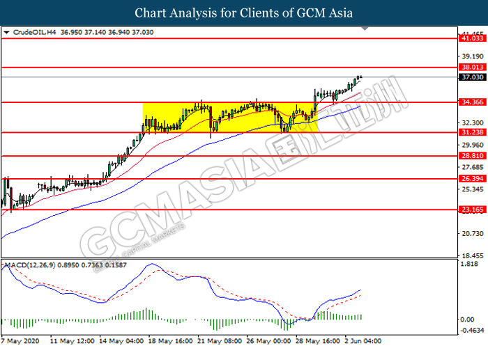 CrudeOIL, H4: Crude oil price was traded higher following prior breakout above the previous resistance level at 34.35. MACD which illustrate bullish bias momentum suggest the commodity to extend its gains toward the resistance level at 38.00.