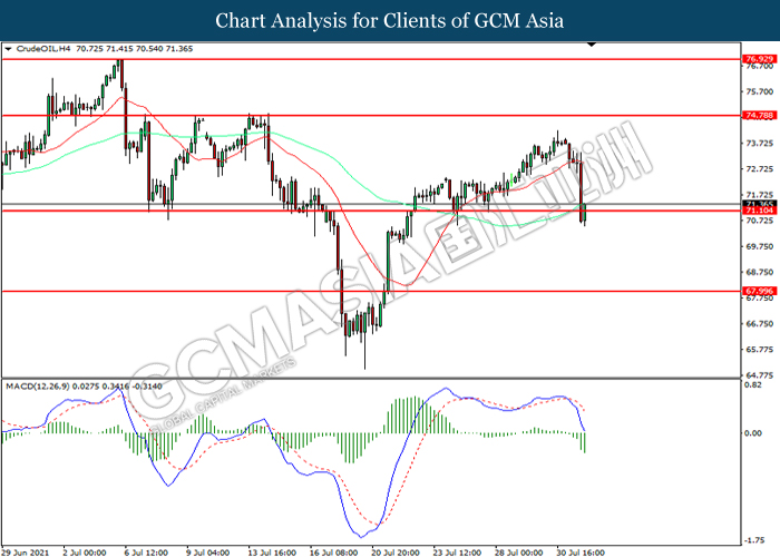 CrudeOIL, H4: Crude oil price was traded lower while currently testing the support level at 71.10. MACD which illustrated increasing bearish momentum suggest the commodity to extend its losses after it successfully breakout below the support level.