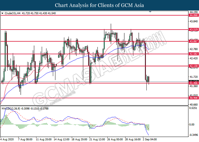 CrudeOIL, H4: Crude oil price was traded lower while currently testing the support level at 41.45. MACD which illustrated bearish bias momentum suggest the commodity to extend its losses after it successfully breakout below the support level.