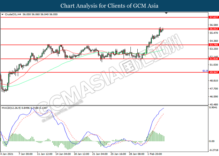 CrudeOIL, H4: Crude oil price was traded higher while currently testing the resistance level at 56.00. MACD which illustrated diminishing bullish momentum suggest the commodity to be traded lower in short-term as technical correction.
