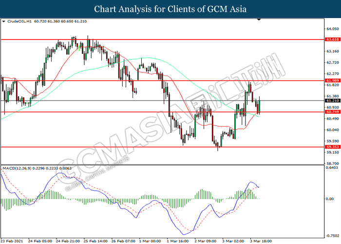 CrudeOIL, H1: Crude oil price was traded higher following prior rebound from the support level at 60.75. However, MACD which illustrated diminishing bullish momentum suggest the commodity to extend its losses after it successfully breakout below the support level.
