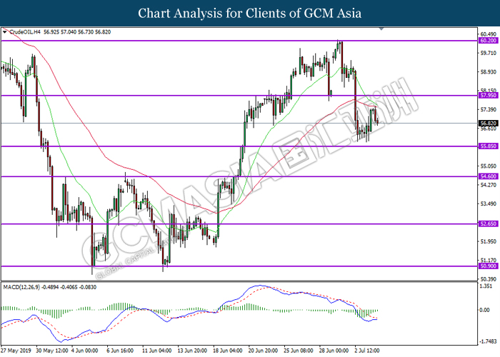 CrudeOIL, H4: Crude oil price was traded lower following prior retracement from the 60-MA line (red). MACD which illustrate persistent bearish momentum suggest the commodity to extend its losses towards the support level 55.85.