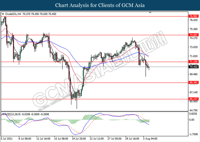 CrudeOIL, H4: Crude oil price was traded lower following prior breakout below the previous support level 71.10. MACD which illustrate bearish momentum signal suggest the commodity to extend its losses towards the support level 68.40.