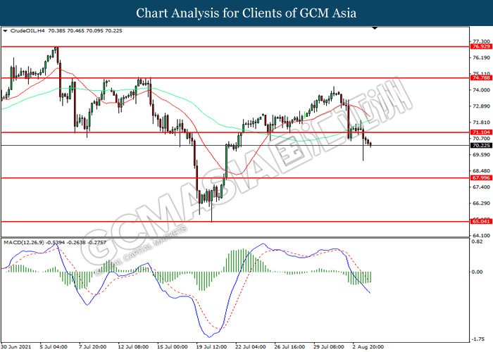 CrudeOIL, H4: Crude oil price was traded lower following prior breakout below the previous support level at 71.10. However, MACD which illustrated diminishing bearish momentum suggest the commodity to be traded higher in short-term as technical correction.