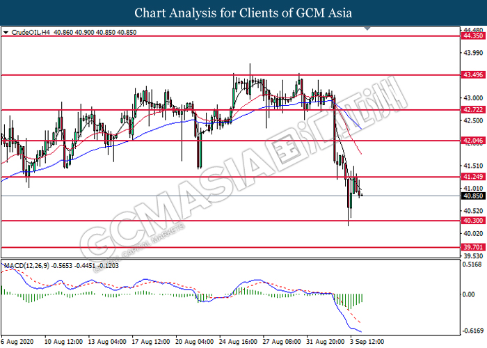 CrudeOIL, H4: Crude oil price was traded lower following prior retracement from the resistance level at 41.25. However, MACD which illustrated diminishing bearish momentum suggest the commodity to undergo technical correction in short term.