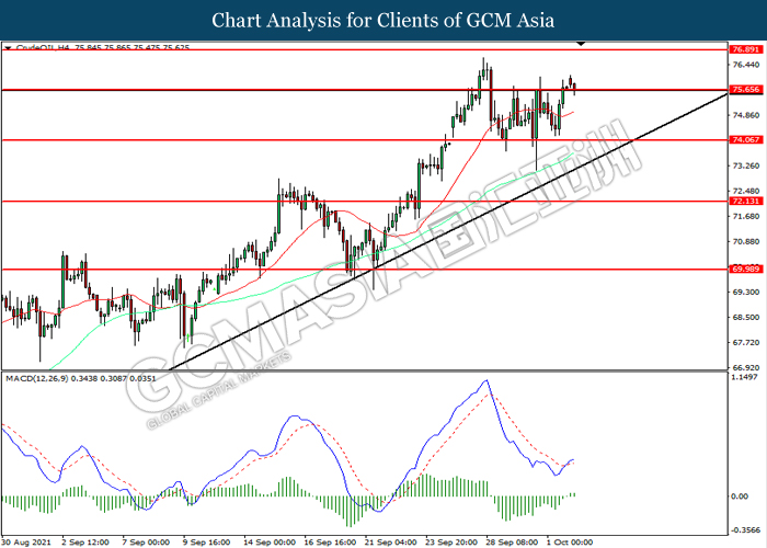 CrudeOIL, H4: Crude oil price was traded higher while currently testing the resistance level at 75.65. MACD which illustrated increasing bullish momentum suggest the commodity to extend its gains after it successfully breakout above the resistance level.