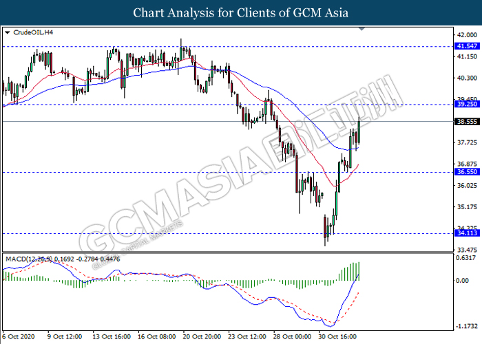 CrudeOIL, H4: Crude oil price was traded higher while currently testing near the resistance level 39.25. MACD which illustrate persistent bullish momentum signal suggest the commodity to extend its gains after it breaks above the resistance level.