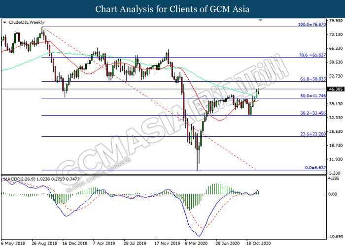 CrudeOIL, Weekly: Crude oil price was traded higher following prior breakout above the previous resistance level at 50.05. MACD which illustrated increasing bullish momentum suggest the commodity to extend its gains toward resistance level at 50.05.