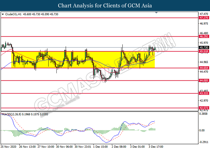 CrudeOIL, H1: Crude oil price was traded higher following prior rebound from the support level at 45.50. MACD which display bullish bias momentum signal suggest the commodity to extend its gains toward the resistance level at 46.30.
