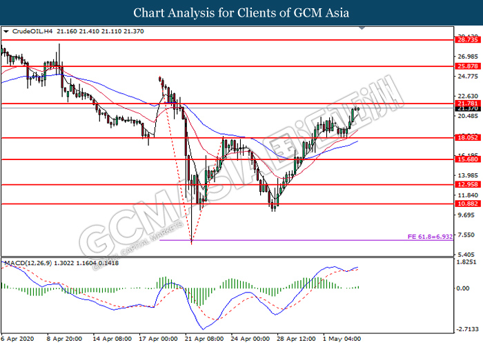 CrudeOIL, H4: Crude oil price was traded higher following prior rebound from the support level at 18.05. MACD which illustrate bullish bias momentum suggest the commodity to extend its gains toward the resistance level at 21.80.