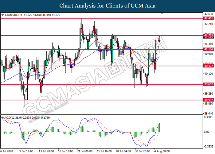 CrudeOIL, H4: Crude oil was traded higher while currently testing the resistance level at 41.70. MACD which illustrate bullish bias momentum suggest the commodity to extend its gains after it successfully breakout above the resistance level.