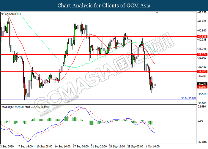 CrudeOIL, H4: Crude oil price was traded lower while currently testing the support level at 37.00. However, MACD which illustrated diminishing bearish momentum suggest the commodity to be traded higher in short-term as technical correction.