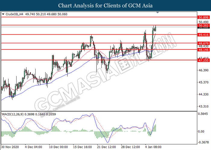 CrudeOIL, H4: Crude oil price was traded higher while currently testing the resistance level at 50.20. MACD which illustrated bullish bias momentum suggest the commodity to extend its gains after it successfully breakout above the resistance level at 50.20.