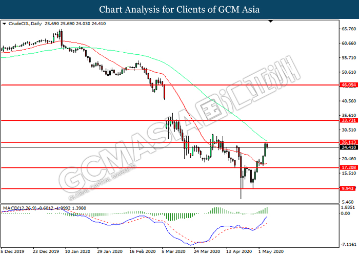 CrudeOIL, Daily: Crude oil price was traded higher while currently testing the resistance level at 26.10. MACD which illustrated increasing bullish momentum suggest the commodity to extend its gains after it successfully breakout above the resistance level.
