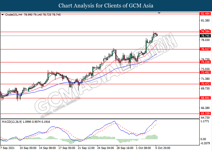 CrudeOIL, H4: Crude oil was traded higher while currently testing near the resistance level 79.40. However, MACD which illustrate diminishing bullish momentum signal suggest the commodity to be traded lower as a technical correction towards the support level 76.40.