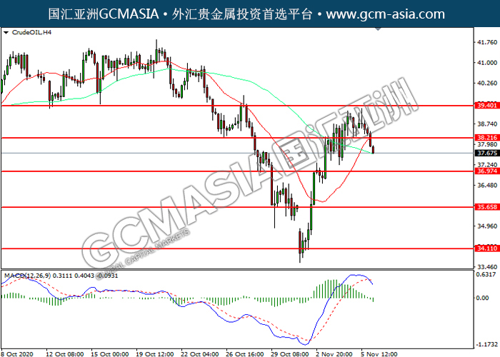 CrudeOIL, H4: Crude oil price was traded lower following prior breakout below the previous support level at 38.20. MACD which illustrated increasing bearish momentum suggest the commodity to extend its losses toward support level at 36.95.