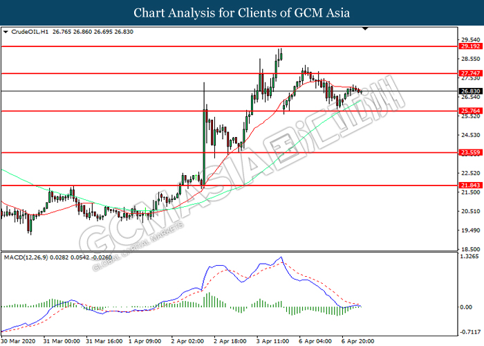 CrudeOIL, H1: Crude oil price was traded higher following prior rebound from the support level at 25.75. MACD which illustrated diminishing bearish momentum suggest the commodity to extend its gains toward resistance level at 27.75.