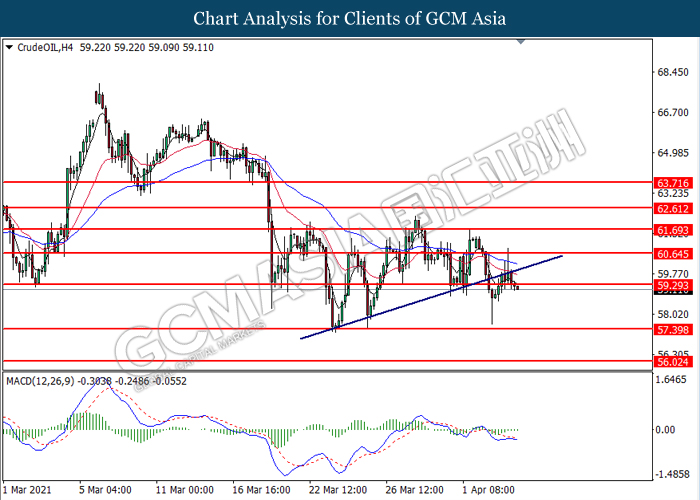 CrudeOIL, H4: Crude oil price was traded lower following prior breakout below the previous support level at 59.30. MACD which illustrated bearish bias momentum suggest the commodity to extend its losses toward the support level at 57.40.