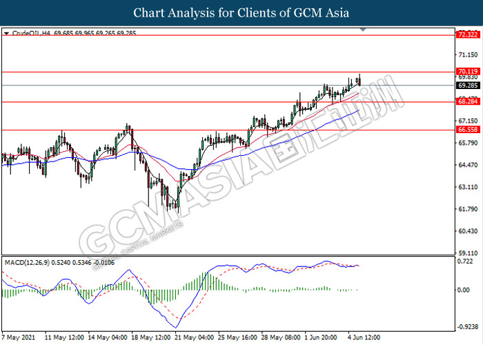 CrudeOIL, H4: Crude oil was traded higher while currently testing near the resistance level 70.10. However, MACD which illustrate bearish bias signal with the formation of death cross suggest the commodity to be traded lower towards the support level 68.30.
