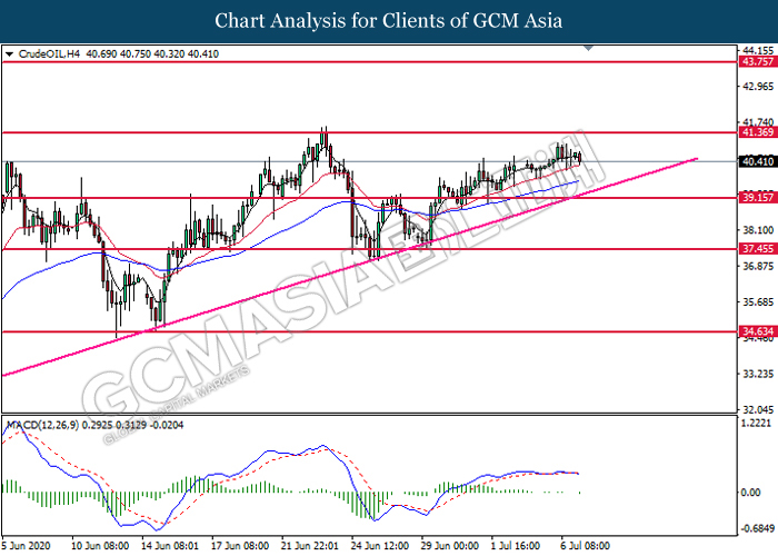 CrudeOIL, H4: Crude oil price was traded lower following prior retracement near the resistance level at 41.35. Due to lack of signal from MACD, it is suggested to wait for further confirmation before entering into the market.