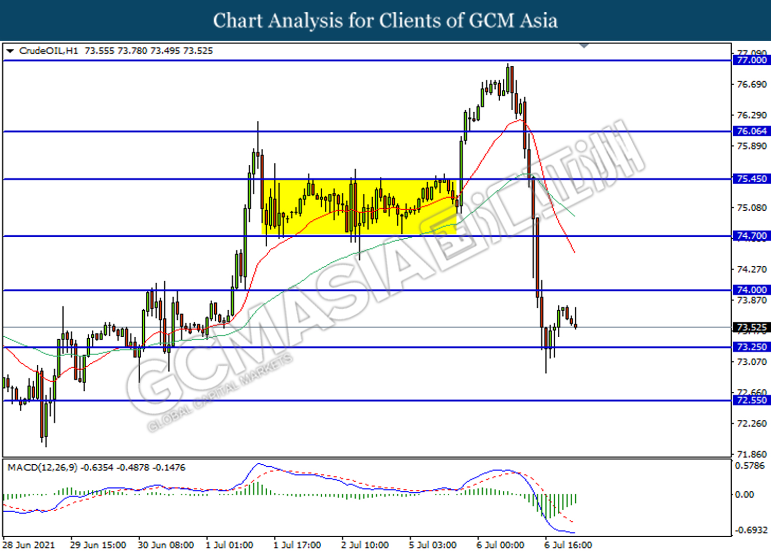 CrudeOIL, H1: Crude oil price was traded lower following prior retracement from the higher level. MACD which shows increasing bearish momentum suggests its price to extend losses in short-term.