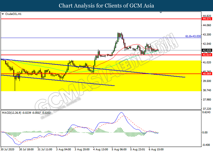 CrudeOIL, H1: Crude oil price was traded lower while currently near the support level at 41.60. MACD which illustrated increasing bearish momentum suggest the commodity to extend its losses after it successfully breakout below the support level.