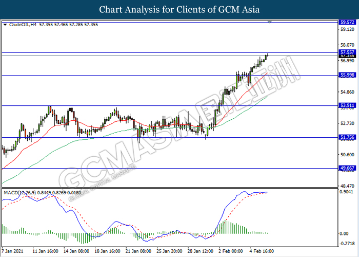 CrudeOIL, H4: Crude oil price was traded higher while currently testing the resistance level 57.55. However, MACD which illustrate diminishing bullish momentum signal suggest the commodity to be traded lower as a technical correction towards the support level 56.00