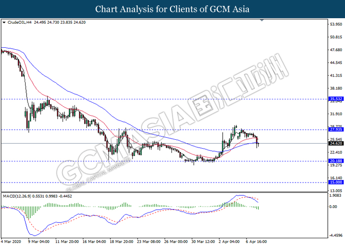 CrudeOIL, H4: Crude oil price was traded lower following prior retracement from the resistance level 27.95. MACD which illustrate bearish momentum signal with the formation of death cross suggest the commodity to extend its retracement towards the support level 20.20.