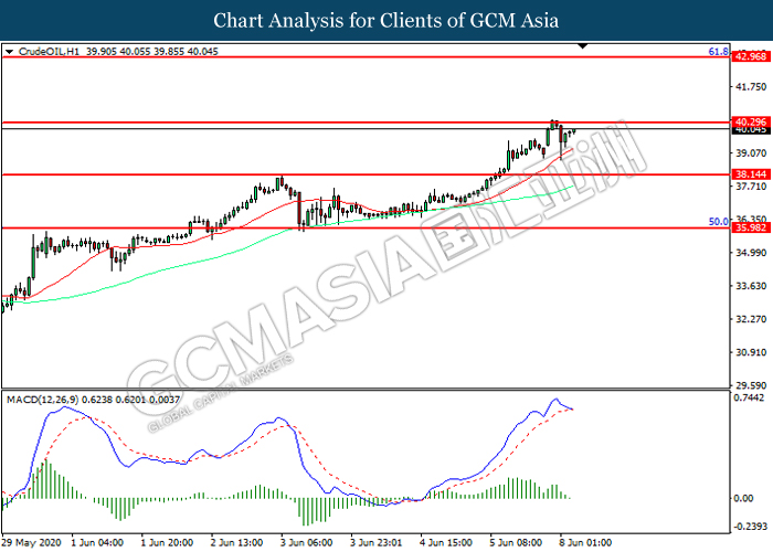CrudeOIL, H1: Crude oil price was traded higher while currently testing the resistance level at 40.30. However, MACD which illustrated diminishing bullish momentum suggest the commodity to be traded lower in short-term as technical correction.
