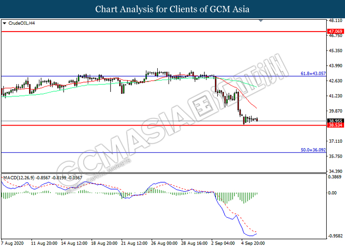 CrudeOIL, H4: Crude oil price was traded lower while currently testing the support level at 38.55. However, MACD which illustrated diminishing bearish momentum suggest the commodity to be traded higher in short-term as technical correction.