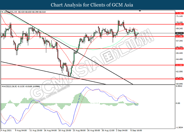CrudeOIL, H4: Crude oil price was traded lower following prior retracement from the resistance level at 69.85. However, MACD which illustrated diminishing bearish momentum suggest the commodity to be traded higher in short-term as technical correction.
