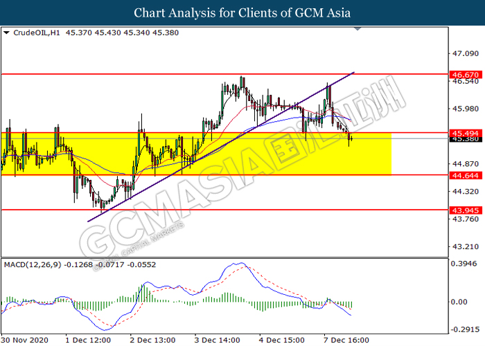 GOLD_, H1: Gold price was traded higher following prior rebound from the support level at 1859.95. However, MACD which illustrate diminishing bullish momentum signal suggest the commodity to undergo technical correction in short term toward the lower level.