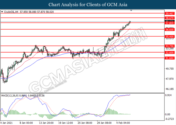 CrudeOIL, H4: Crude oil price was traded higher following prior breakout above the previous resistance level at 57.80. MACD which illustrated bullish bias momentum suggest the commodity to extend its gains toward the resistance level at 58.65.