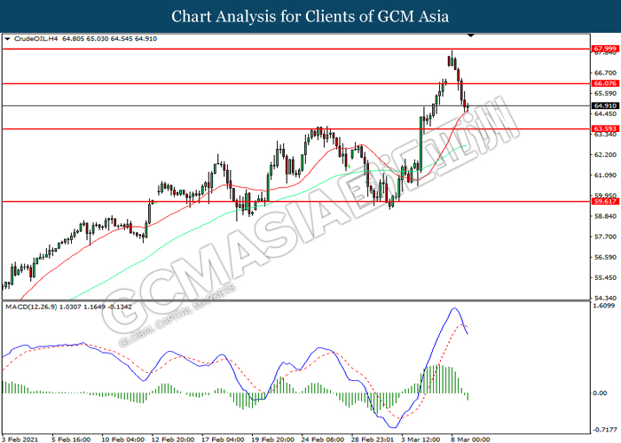 CrudeOIL, H4: Crude oil price was traded lower following prior breakout below the previous support level at 66.05. MACD which illustrated increasing bearish momentum suggest the commodity to extend its losses toward support level at 63.60.