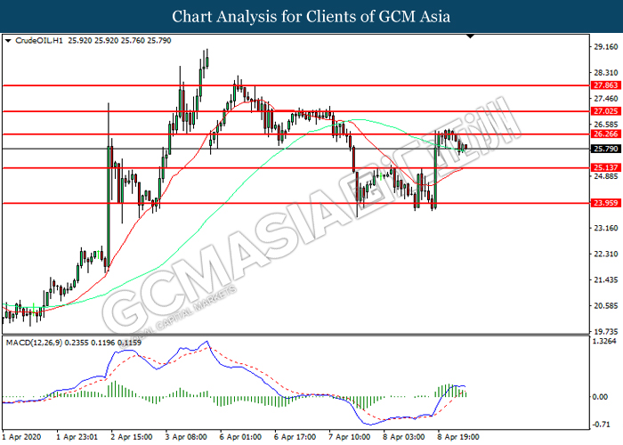 CrudeOIL, H1: Crude oil price was traded lower following prior retracement from the resistance level 26.25. MACD which illustrated diminishing bullish momentum suggest the commodity to extend its losses toward support level at 25.15.