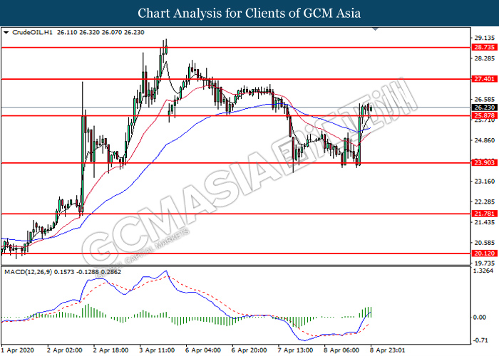 CrudeOIL, H1: Crude oil price was traded higher following prior breakout above the previous resistance level at 25.90. MACD which illustrate bullish bias momentum suggest the commodity to extend its gains toward the resistance level at 27.40.