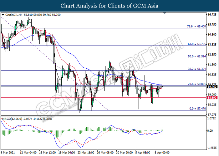 CrudeOIL, H4: Crude oil price was traded higher while currently testing the resistance level at 59.85. MACD which illustrated bullish bias momentum suggest the commodity to extend its gains after it successfully breakout above the resistance level.