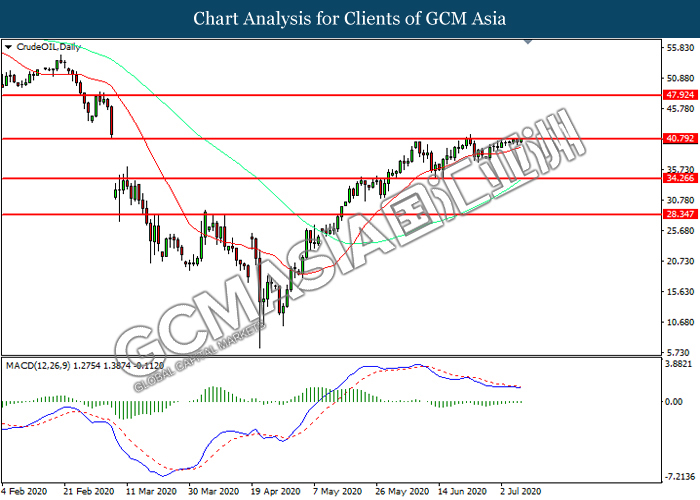 CrudeOIL, Daily: Crude oil price was traded higher while currently testing the resistance level at 40.80. MACD which illustrated diminishing bearish momentum suggest the commodity to extend its gains after it successfully breakout above the resistance level.
