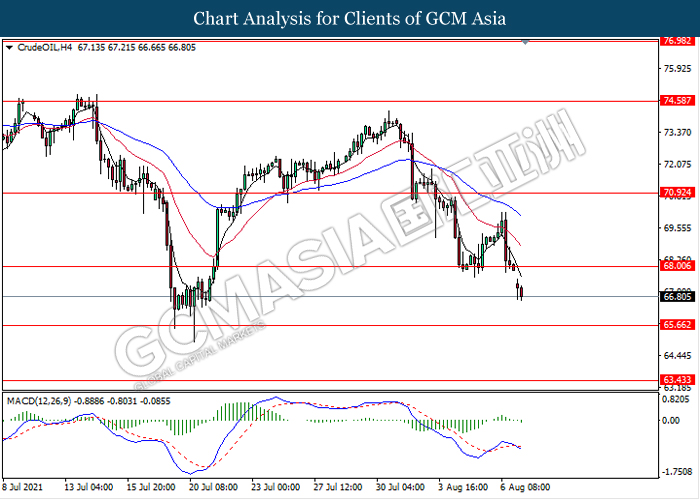 CrudeOIL, H4: Crude oil price was traded lower following prior breakout below the previous support level 68.00. MACD which illustrate bearish momentum signal with the formation of death cross suggest the pair to extend its losses towards the support level 65.65.