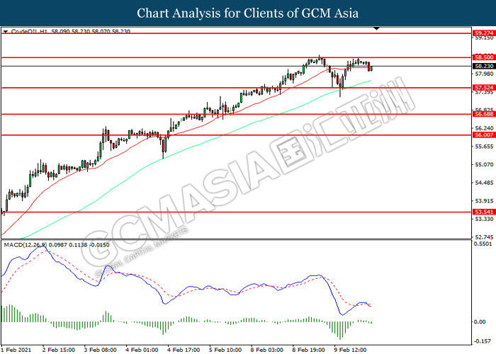 CrudeOIL, H1: Crude oil price was traded lower following prior retracement from the resistance level at 58.50. MACD which illustrated increasing bearish momentum suggest the commodity to extend its losses toward support level at 57.50.